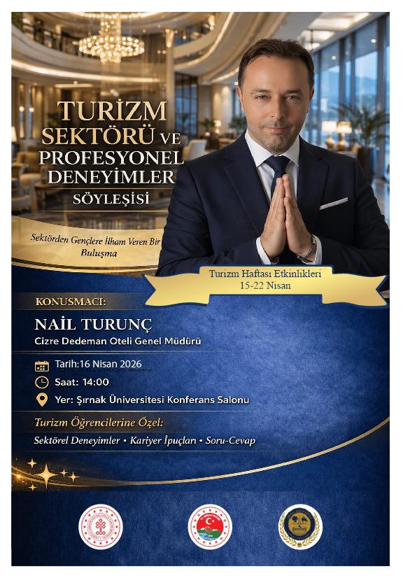 15-22 Nisan Turizm Haftası kutlamaları kapsamında Şırnak İl Kültür ve Turizm Müdürlüğü ve Şırnak Üniversitesi Turizm İşletmeciliği ve Otelcilik Yüksekokulu işbirliği ile "Turizm Sektörü ve Profesyonel Deneyimler Söyleşisi" programı gerçekleştirildi. 16 Nisan 2026 tarihinde, gerçekleştirilen etkinliğe,